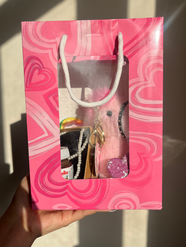 پک اقتصادی صورتی شامل عروسک صورتی گردنبند و دستبند مرواریدی نوتلا مینی و ابنبات و بگ و پوشال