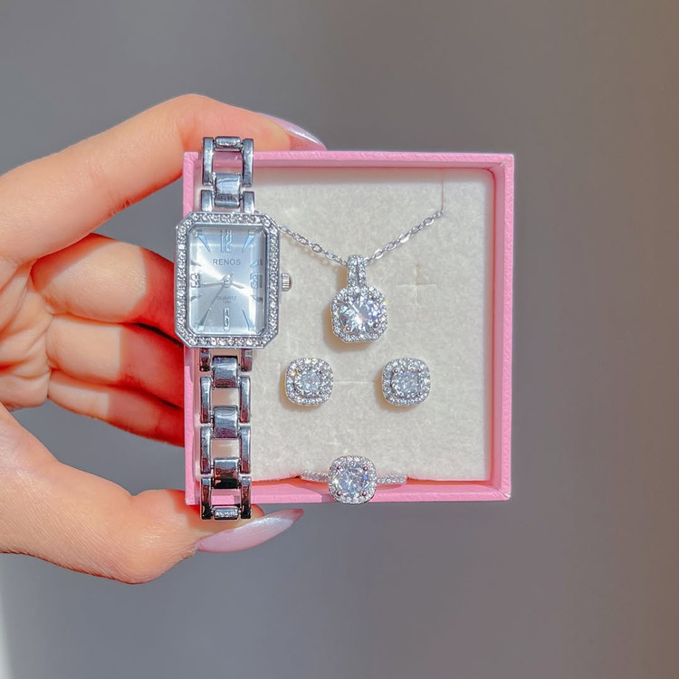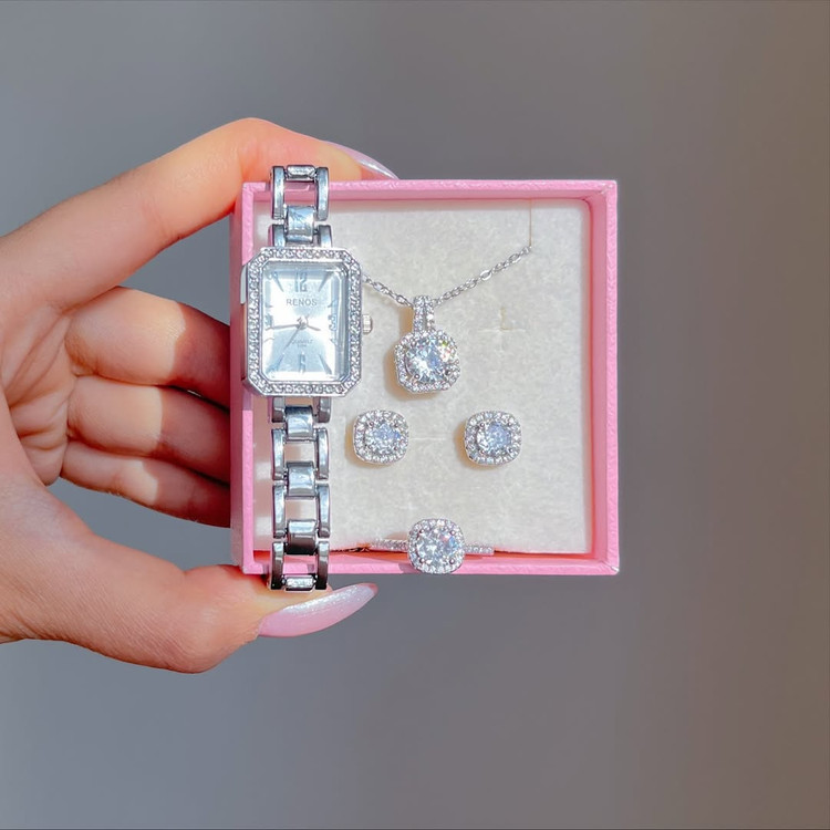 نیم ست شامل گوشواره میخی و انگشتر فری سایز با ثبات رنگ خوب و ساعت اقتصادی جذاب با بند کوتاه. ریزش نگین ندارد.